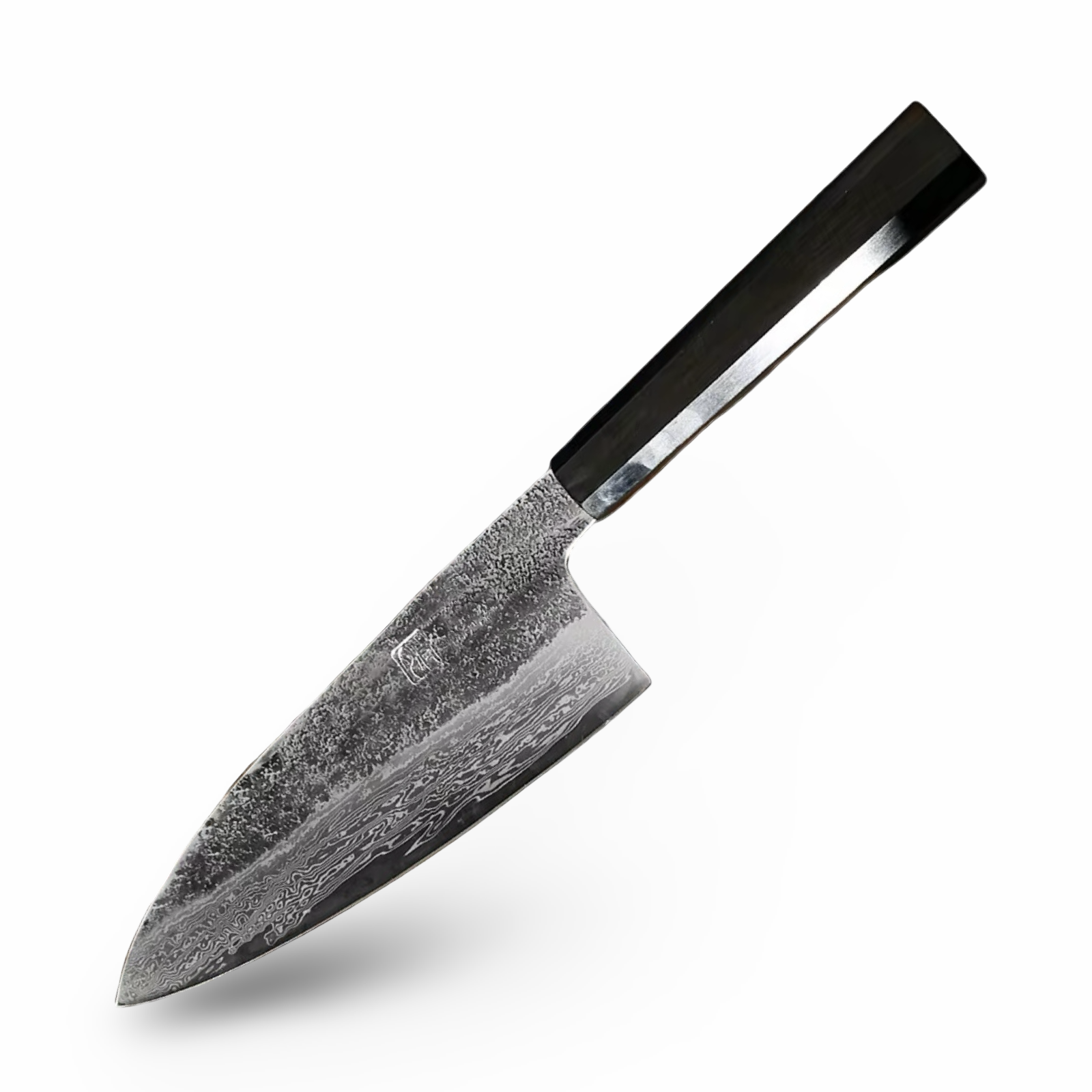 Denne Deba-kniv er smedet i 67-lags damaskus-stål med en VG10 kerne og leverer ekstrem skarphed, styrke og holdbarhed. Den tunge, kraftige klinge er designet til fisk og fjerkræ, hvor præcise snit og kontrolleret kraft er nødvendigt. Det ottekantede håndtag i ibenholt og bøffelhorn giver et sikkert, komfortabelt og balanceret greb, selv ved længere tids arbejde. En kniv til dig, der ønsker professionel kvalitet i både funktion og udtryk.